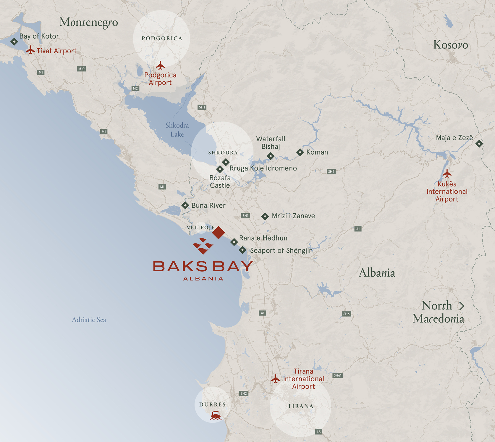 Located close to the coastal town of Baks Rjoll, Baks Bay faces out onto the Adriatic Sea. It is within easy reach of Tirana and its airport, with numerous connections to the rest of Europe and beyond, as well as being close to nearby Montenegro.